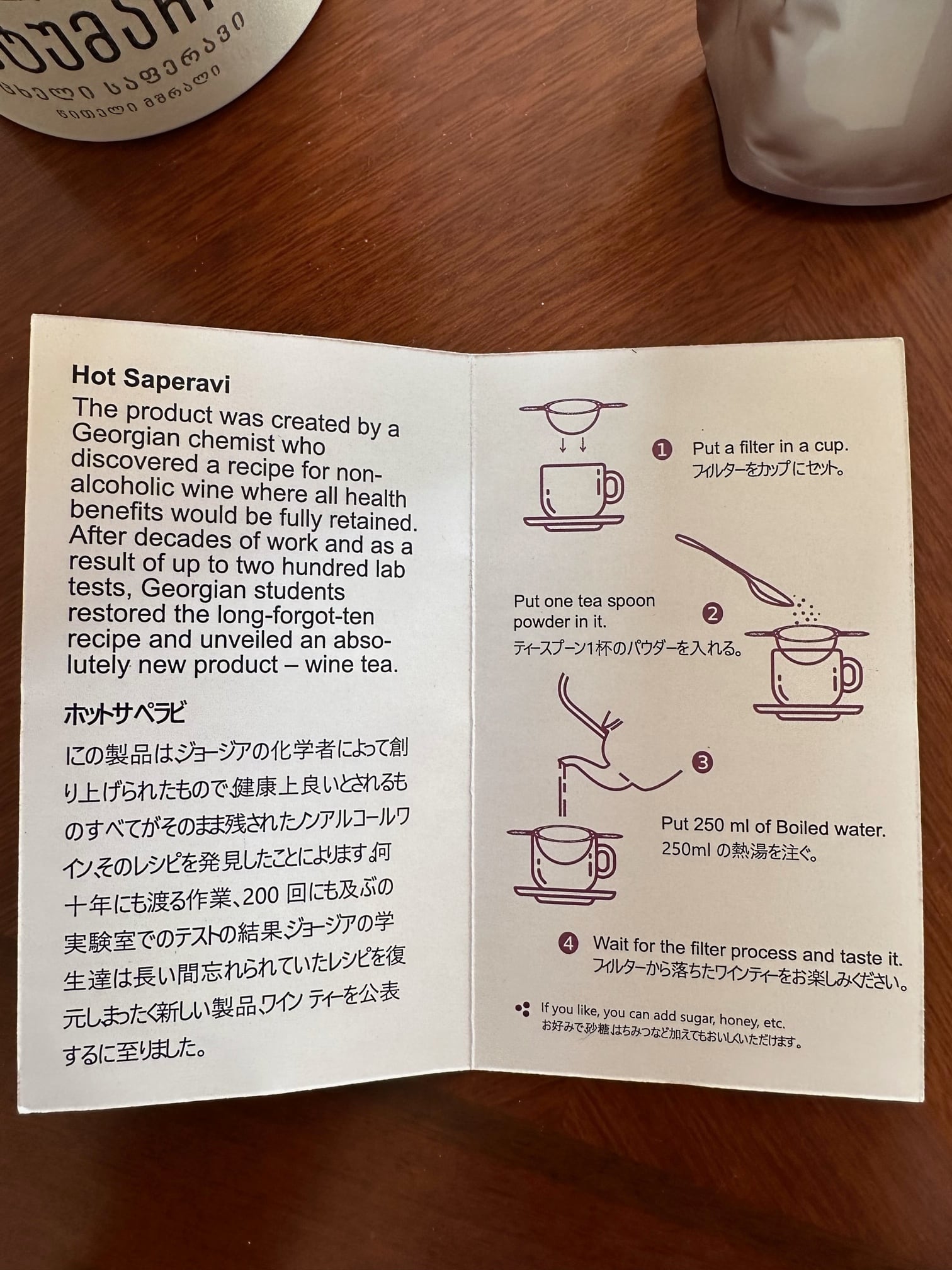 ジョージア STUMARI社製 ノンアルコール WINE TEA粉末100g 入り:ユネスコでワイン発祥の地と認定されたジョージア。そこで古くから栽培されているサペラビ葡萄から醸造されるワインは世界的に有名です。そのワインとワイン製造時に使った皮、種をハイテク分解し混ぜ、アルコールを除去して粉末にしたものが100%ナチュラルのワインティーです。茶漉しで紅茶を淹れるようにお湯を注げば出来上がり。ワイン風味と酸味の絶妙なバランス あ これは新しい飲み物だ!